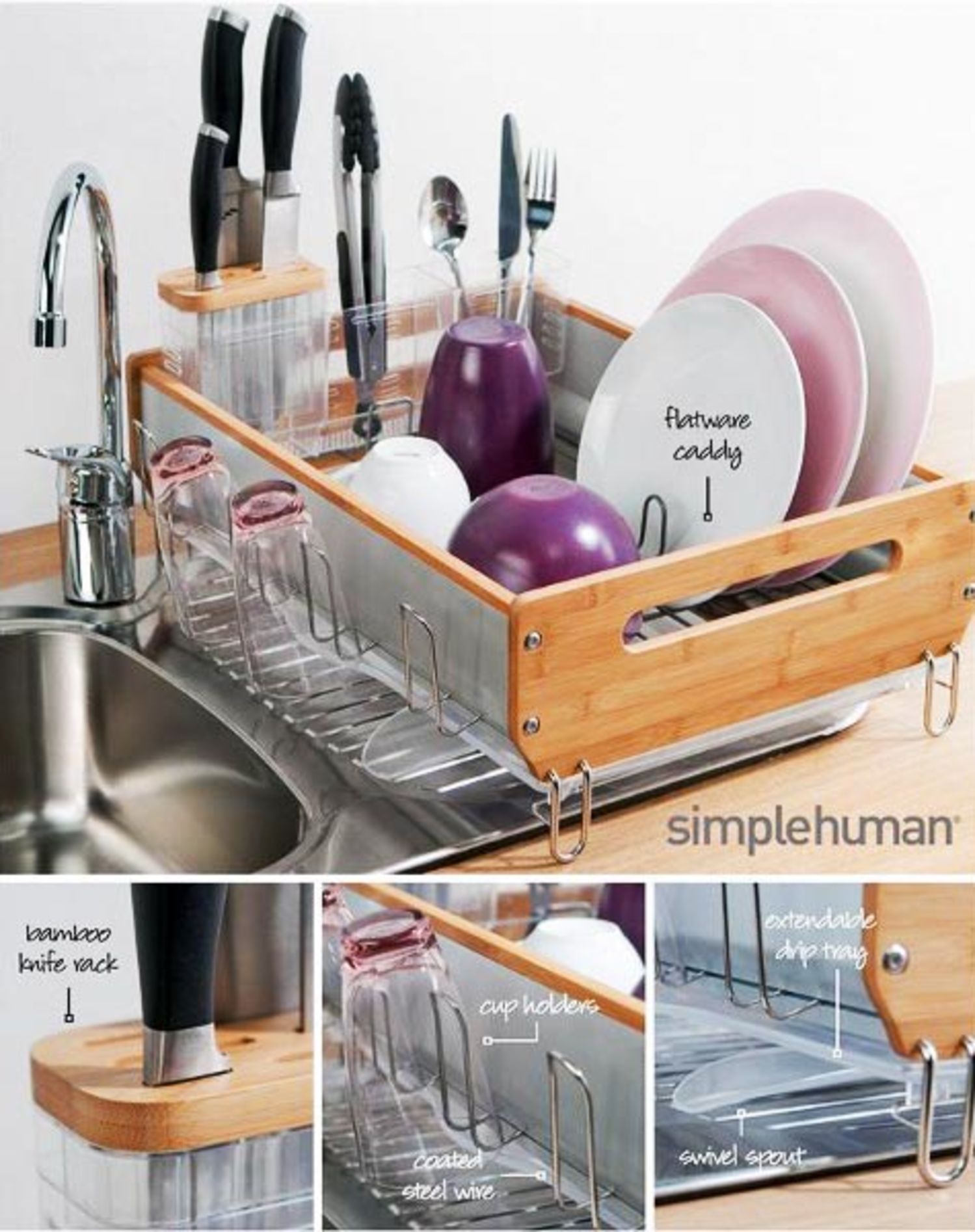 It has a swivel spout that pivots so you can drain water directly into the sink, and an anti-residue hydrophilic coating that prevents residue buildup and water. simplehuman Dish Rack - A dish rack is rarely the focal point of a kitchen but the simplehuman dish rack is sure to immediately turn heads thanks to its marvelous construc.